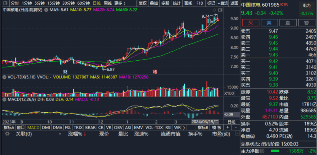 在二级市集上,2023年以来,中国核电的股票抓续受到资金追捧,于今股价涨幅朝上60%。近日,该公司股价又刷新了8年多新高,市值攀升至1781亿元。