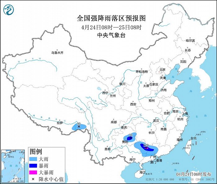 中央征象台4月24日06时无间发布暴雨蓝色预警:瞻望,4月24日08时至25日08时,贵州中东部、广西东北部、广东中西部等地部分地区有大到暴雨,局地大暴雨(100~120毫米)。上述部分地区伴有短时强降水(最大小时降雨量30~50毫米,局地可跨越60毫米),局地有雷暴大风、冰雹等强对流天气。