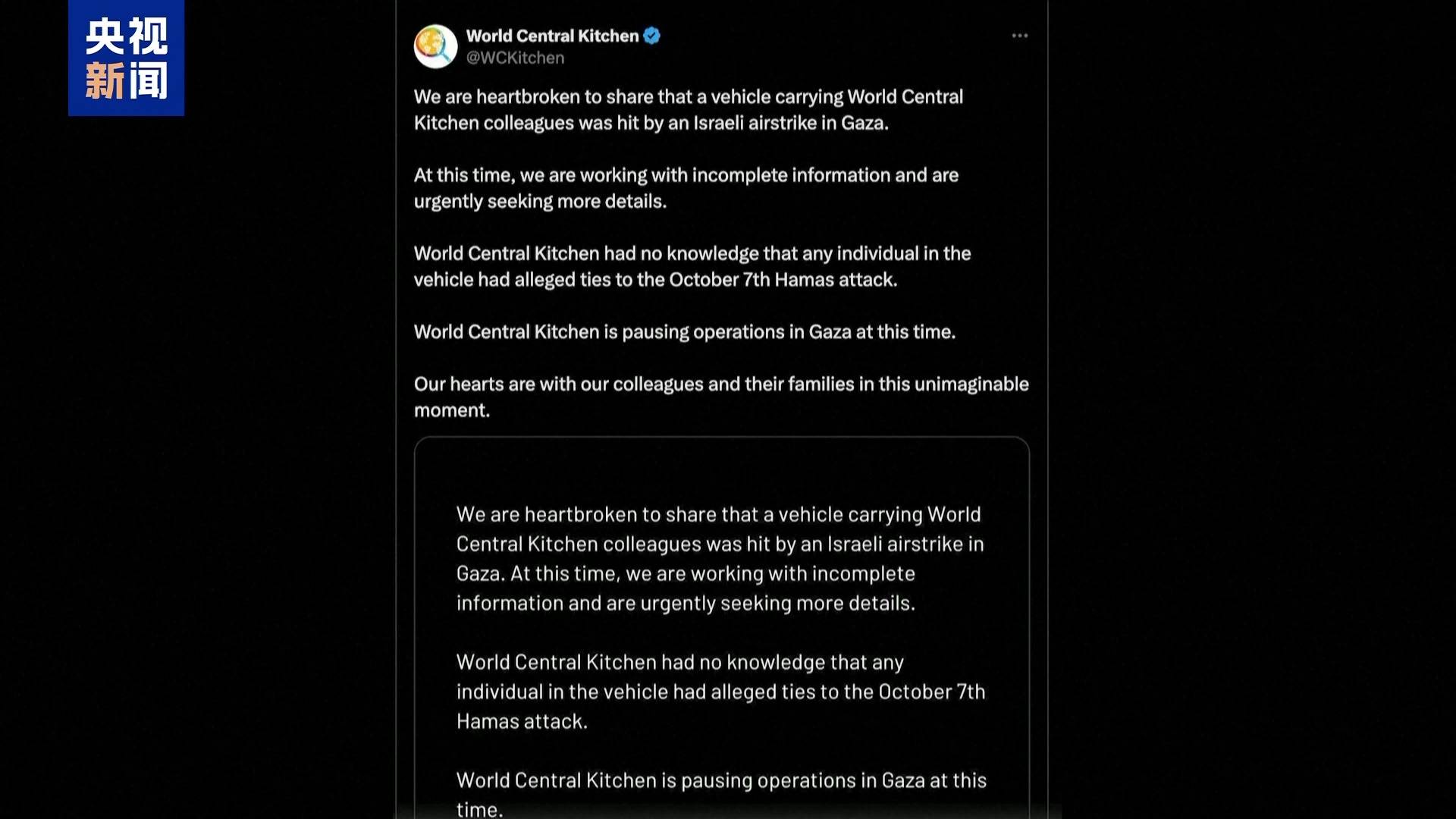 “宇宙中央厨房”暂停在加沙地带运营